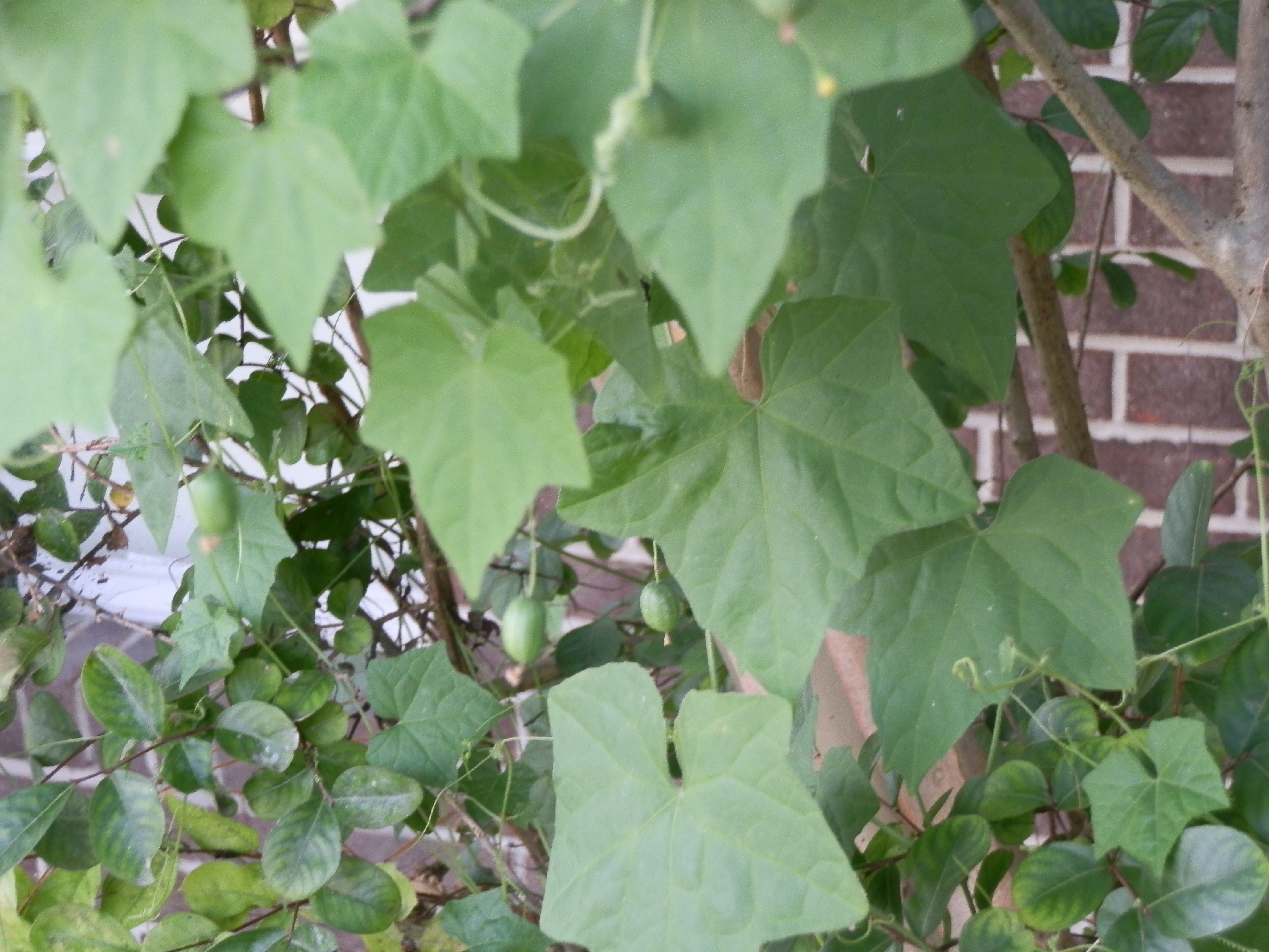 Delicate stems and soft English ivy-shaped leaves with tendrils can envelop shrubs in short order. Tiny yellow flowers look like cucumber or watermelon blooms and it’s easy to tell which are male and which are female just as it is on domestic types.