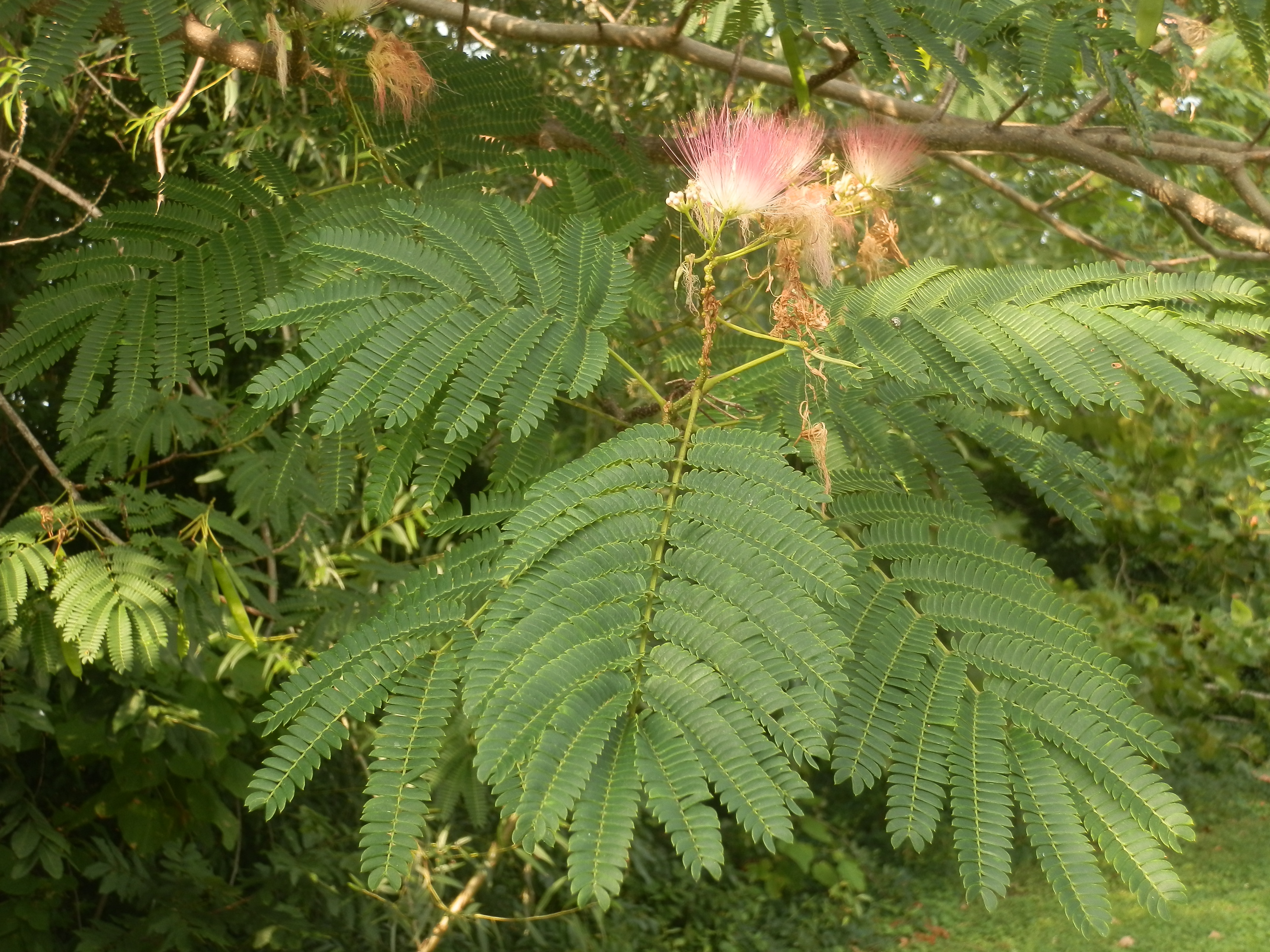 Silk trees are a member of the bean family, which have bean like pods after the flowers disappear.The individual leaflets are small.they can reach heights of 25 feet and a spread of 35 feet.