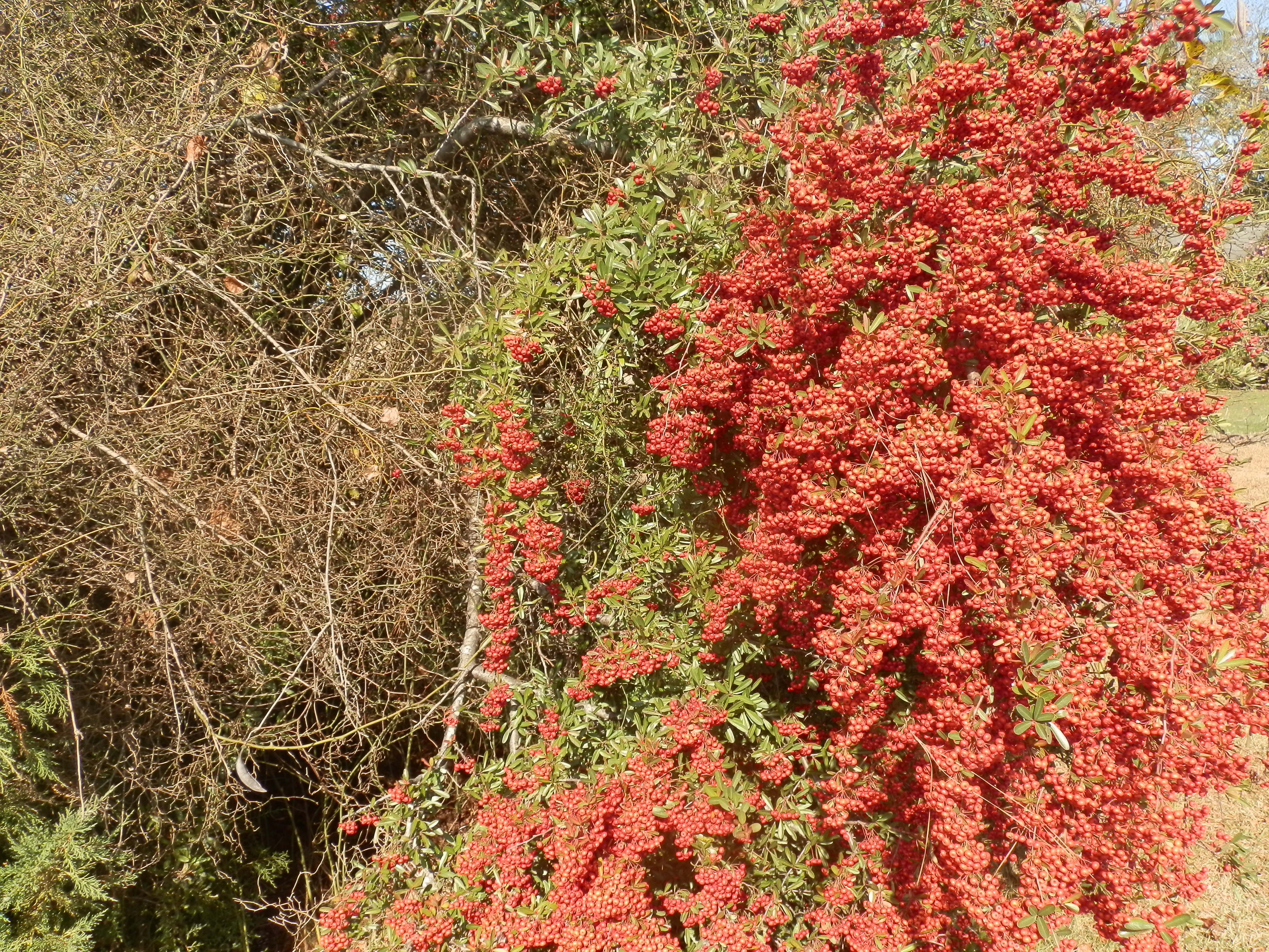 Pyracantha can be loaded with fruit when grown in sunny locations. We call the fruit berries, but they are really more similar to miniature apples. Correctly, they are termed pomes, as they have a core which contains the seeds.