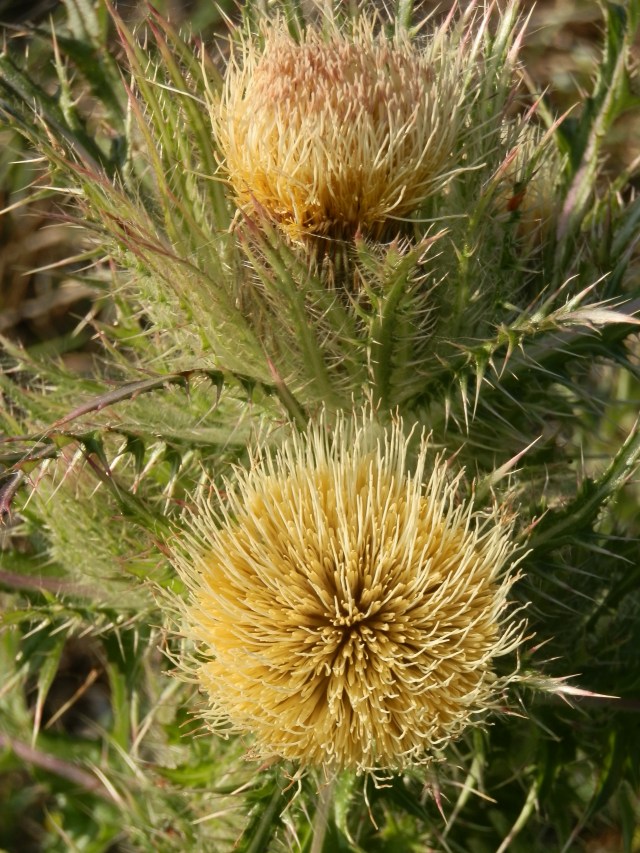 True bull thistle (Cirsium vulgare) is a biennial. It produces basal rosettes of leaves the first year along with a thick taproot. The second season it sometimes attains heights of six feet. Despite the diminutive stature of the first year foliage, spines at midribs and tips of leaf lobes are still just as aggressive as older specimens. The yellow flowered type (Cirsium horridulum), sometimes called yellow thistle or horrid thistle is an annual. When you look at the spines you can see where the horridulum came from.