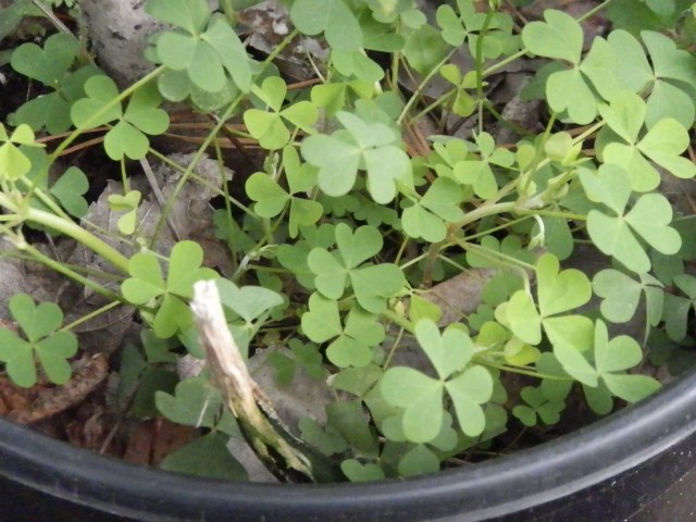 We usually refer to wood sorrel as Oxalis, it’s genus name. Both clovers and Oxalis have three leaflets per leaf. Both frequently wind up in our nursery pots, but that’s where the comparison ends.