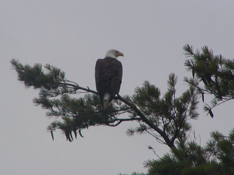 Large mature bald eagle perched in a white pine in downeast Maine
