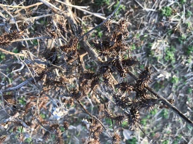 I was walking around in the brush recently and noticed thick stands of cockleburs (Xanthium sp.). I tried to avoid them, but before I realized it my pants collected dozens.